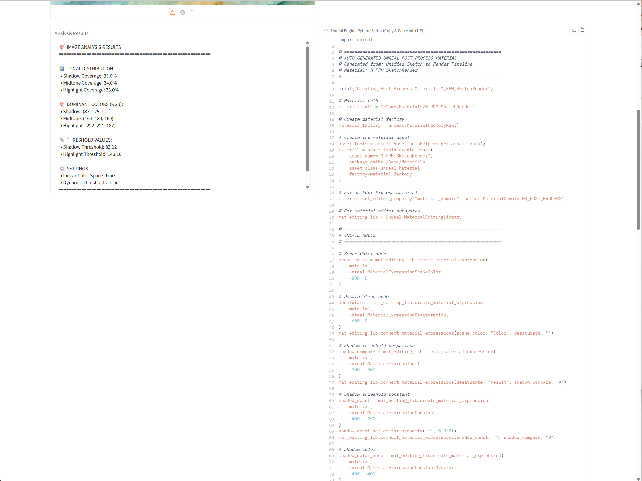 This week has been all AI Studio and Claud AI, attempting to combine my code and Itim’s code. After initially integrating them, I dove deeper into creating a more accurate Unreal Post-Process Material Generator based on Itim’s Sketch-to-Render Output. Therefore, creating a polished pipeline that generates an accurate PPM at the push of a button.